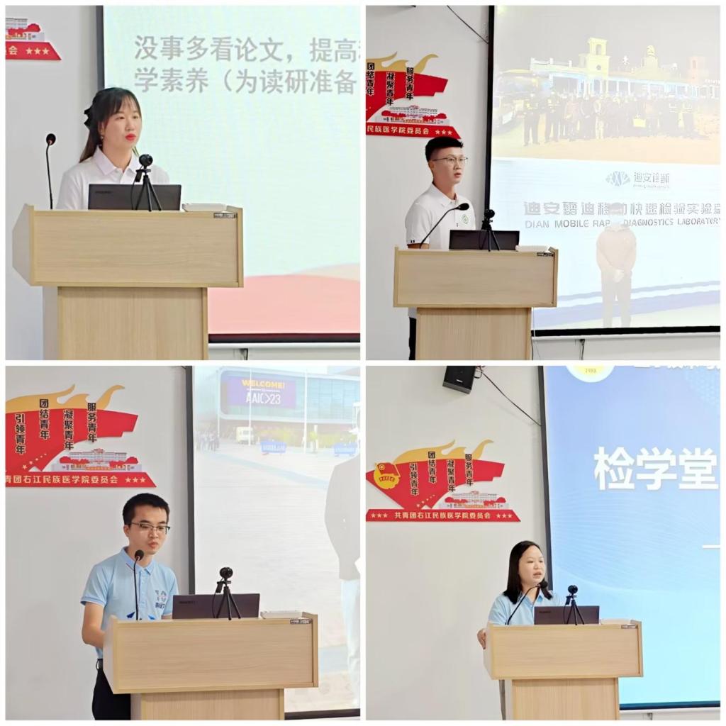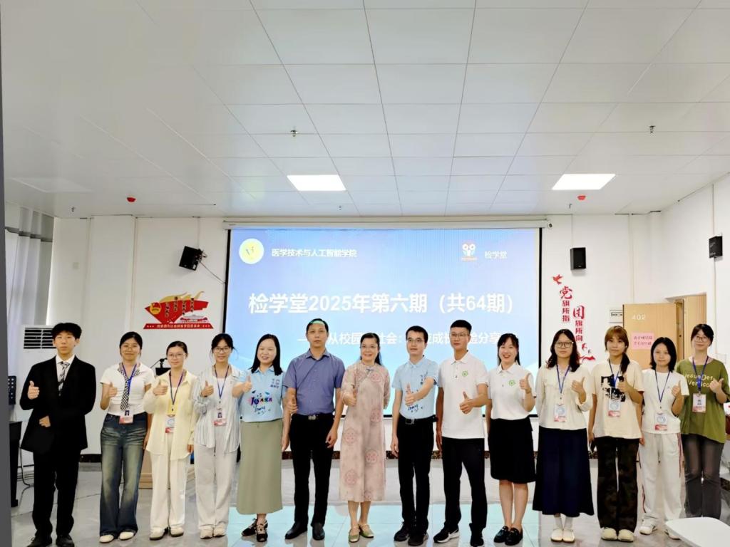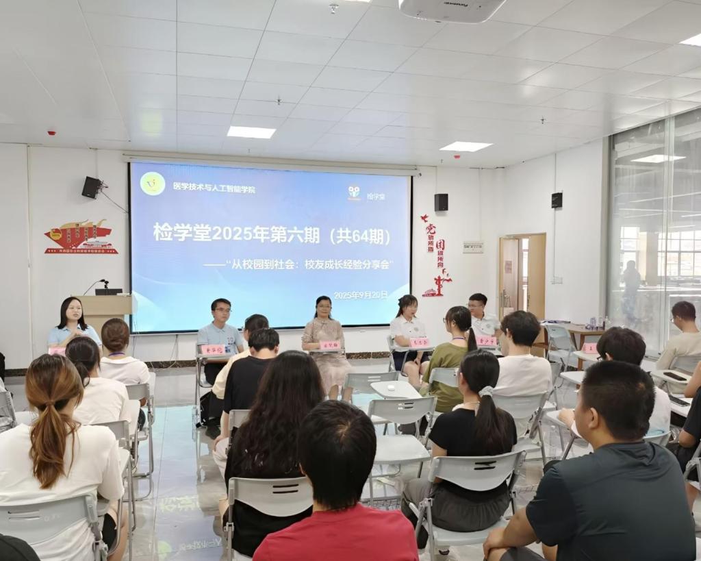 分享环节中,四位校友结合自身在医学技术领域的成长轨迹与从业经验,从不同维度为学弟学妹提供实用指导。韦月荣学姐以 “大学是成长的‘黄金塑造期’” 为核心,强调自律与自学能力是专业学习的关键,建议同学们在深耕专业知识的同时,积极发展兴趣爱好,实现 “专业能力 + 综合素养” 双提升。黄华佗学长详细分享实习期间 “主动参与实验操作、大胆向带教老师提问” 的实操技巧;针对考研规划,他提出 “提早明确目标院校、制定阶段性复习计划、坚持复盘调整” 的三步走策略,帮助同学们避开备考误区。蓝娟红学姐结合自身考取医疗卫生系统公职的经历,拆解考公 “笔试 + 面试” 全流程重点,指出除专业知识外,公文写作、沟通协调等综合素质同样重要,建议同学们通过参与学生工作、社会实践提升相关能力。黄少宇学长讲述自己在基层医疗机构工作及参与抗疫的经历,以 “在一线坚守中成长” 的真实故事,激励同学们珍惜大学时光,树立 “以医学技术服务社会” 的责任意识,通过持续学习与实践突破自我。互动环节中,校友们针对 “医学 AI 方向考研院校选择”“检验专业实习单位优先级”“考公与就业的时间平衡” 等学生高频提问,逐一耐心解答,现场交流氛围热烈。