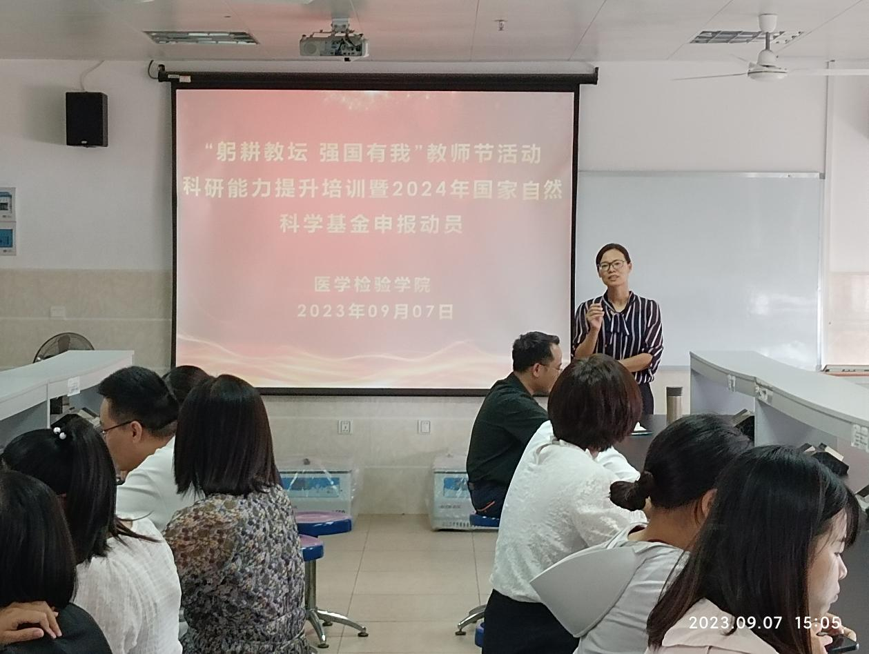 9月7日下午,在7栋703实验室组织“‘躬耕教坛 强国有我’教师节活动科研能力提升培训暨2024年国家自然科学基金申报动员”,活动由庞雅琴副院长主持。