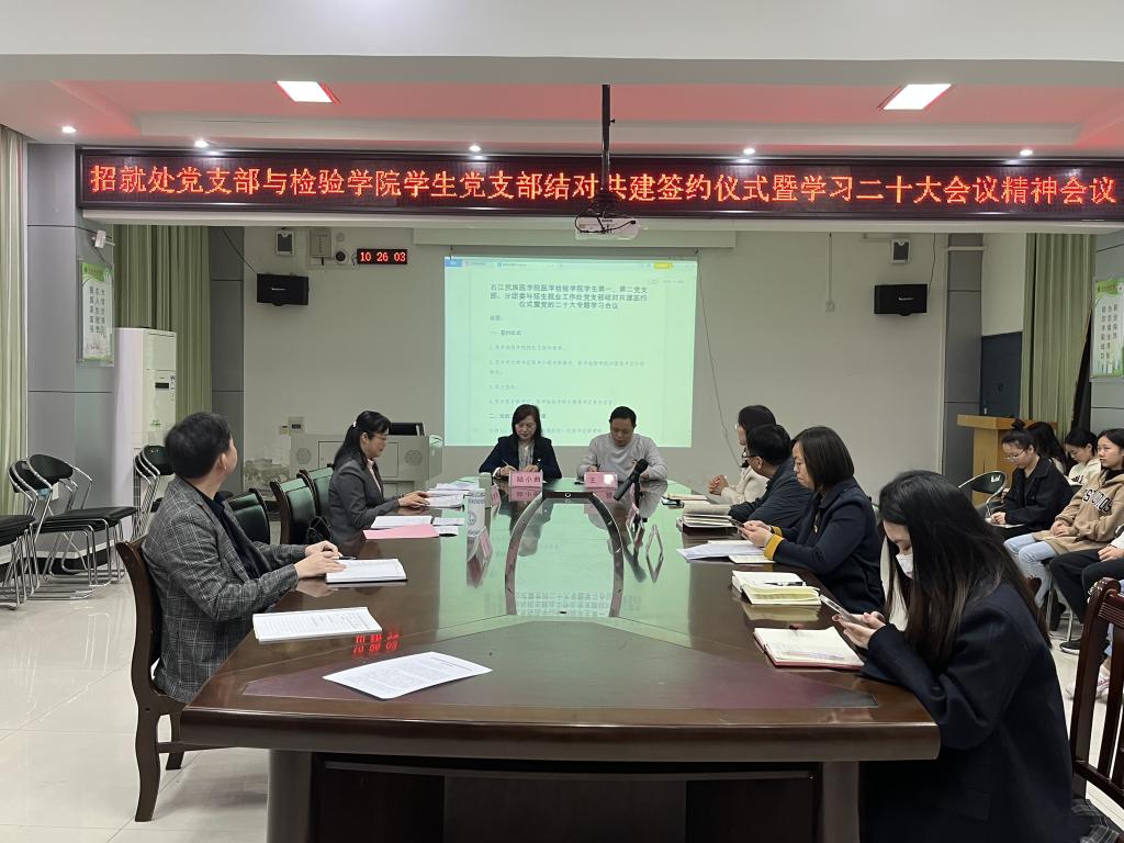 3月29日上午10:00在学校4-101会议室医学检验学院分团委与学校招生就业处党支部签订党团共建协议。会议由招生就业处党支部书记陆小曲主持。