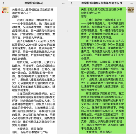 5月8日,为营造活动氛围,医学检验科党支部发出“热血照耀希望:关爱地贫儿童无偿献血行动倡议”倡议,号召科室全体党员职工、医务人员及社会爱心人士加入为地贫患儿无偿献血队伍。