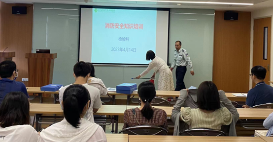 全体实验室人员在集中观看“消防救火警示教育视频”后,由保卫科专业人员对实验室人员进行救火防灾、安全逃生的技能培训,在保卫科同志专业、仔细的讲解、示范下,职工同志们又进一步熟悉了常用灭火器的适用范围、操作步骤、注意事项等知识,最后有两位新员工主动上场对救火流程进行现场操作实训体验。