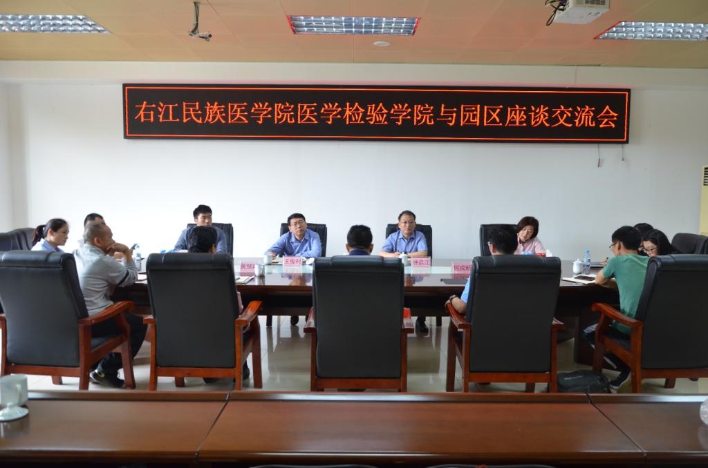 科技园区副书记、常务副主任王晓主持座谈会。王晓对王俊利一行的到来表示欢迎,并汇报了百色科技园区的发展历程、现状与规划,提出了科技园区在人才培养和科研创新方面的科技需求。副主任黄慧翔对产业园区博士后工作站、园区规划和生物健康产业园建设进行深度交流。何成新介绍了园区阿拉伯木聚糖生产、芒果药用价值开发等产业的研究现状。王俊利院长针对医学检验学院的人才培养,专业设置,生物医药与大健康现代产业学院产业发展规划等进行介绍。今后将积极学习和借鉴园区的经验和做法,同时要进一步基于我校现代产业学院建设契机,加强与产业园区,特别是生物健康产业园相关企业的交流与合作,共同为区域生物健康经济产业发展贡献高校力量。交流期间,与会人员就项目合作政策,大学生实习基地和创业孵化基地建设,生物健康产业区项目合作,阿拉伯木聚糖功效开发等进行了深入交流。
