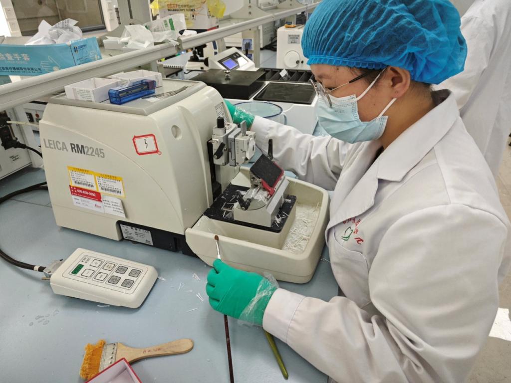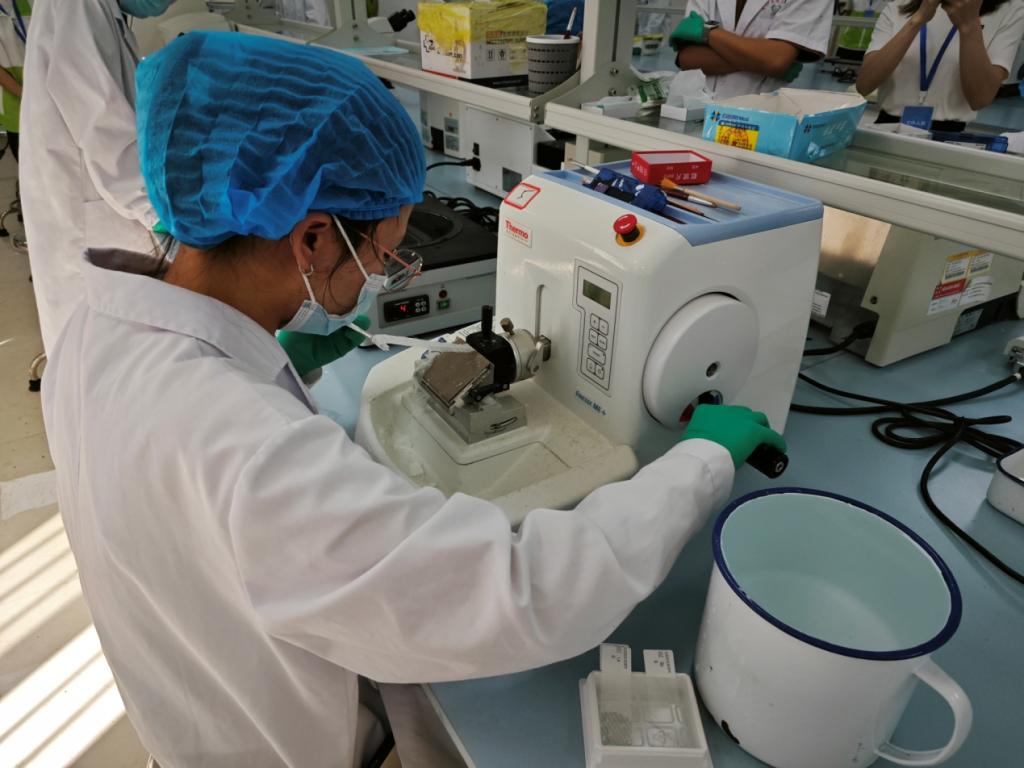 竞赛设抽签与统分、切片、染色、选片和评片五个环节;为保证竞赛的公平性,评片环节采取盲审制。竞赛伊始,选手先抽签决定出场顺序。切片染色赛场上,选手们有条不紊地按照标准化、规范化程序开展病理切片和HE染色过程,参赛选手们都积极展现自己最佳技艺和风采。评片环节,评委们对选手们制片的质量、染色效果逐一打分评价。