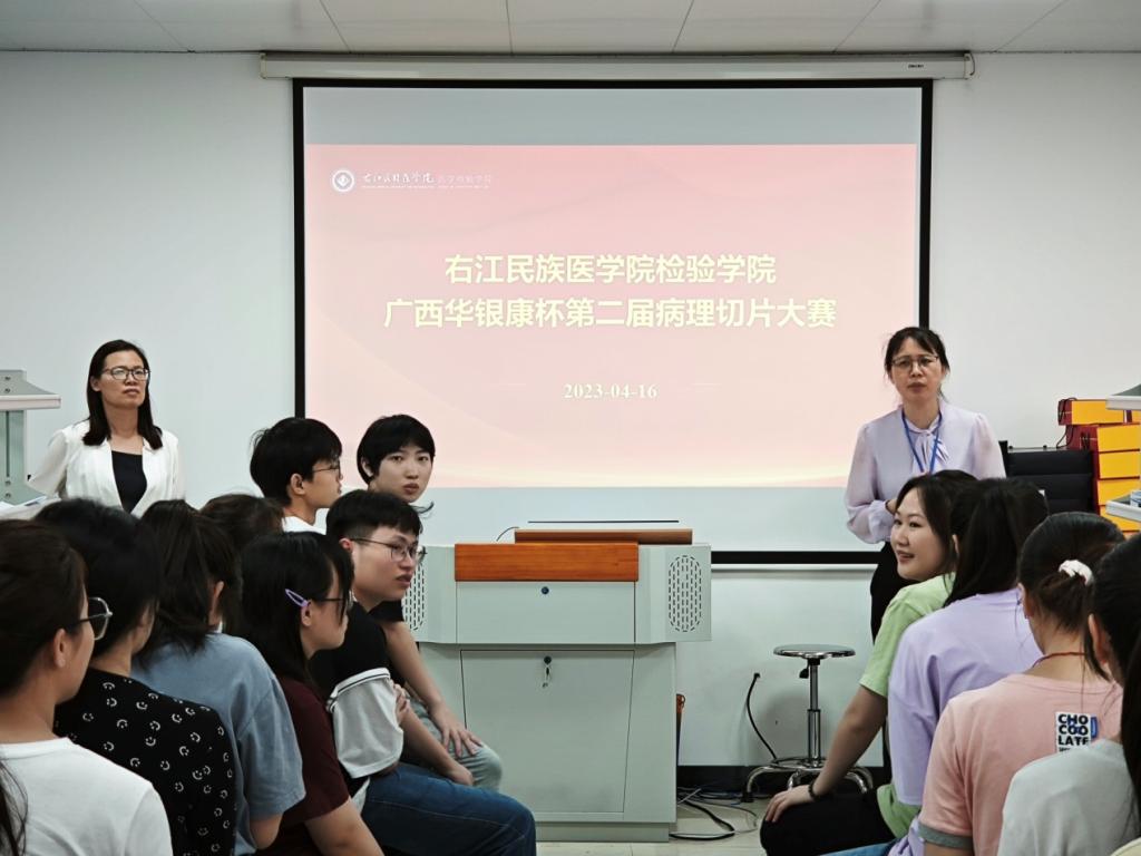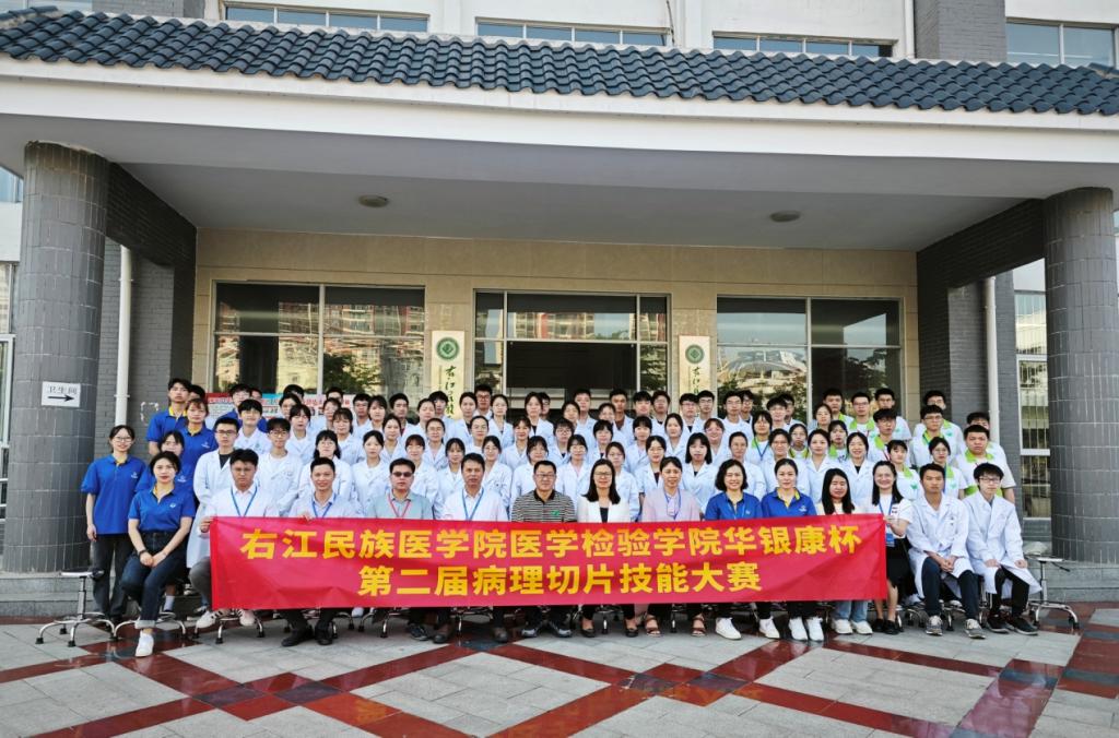 4月16日,由医学检验学院举办,临床病理诊断与研究中心承办,广西华银医学检验所协办的生物医药与大健康现代产业学院校企协同育人之华银康杯第二届病理切片技能大赛在我校西区综合楼医学实验技术实验室顺利举办。来自19级医学实验技术本科实习生、华银培训生和20级医学实验技术本科专业大学三年级学生共65名选手同场竞技。大赛评委来自广西华银医学检验所病理实验室赵维聪主任、百色市人民医院病理科副主任李旭祥、临床病理诊断与研究中心黄炳臣主任、唐奇燎老师四位资深病理专家。医学检验学院副院长兼生物医药与大健康现代产业学院副院长庞雅琴和医学实验技术专业负责人朱晓莹到场观看竞赛,副院长庞雅琴进行了大赛开幕致辞。