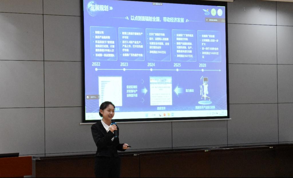 会议还邀请了荣获第八届中国国际“互联网+”大学生创新创业大赛国家级铜奖的路演人杨烨鑫同学,将获奖项目“优呼吸”进行了精彩展示。该同学思路清晰、语言流畅、坚定自信的表现进一步说明,通过参加“互联网+”比赛对自身综合能力的提升大有裨益,极大地鼓舞了同学们参加比赛的热情和愿望。