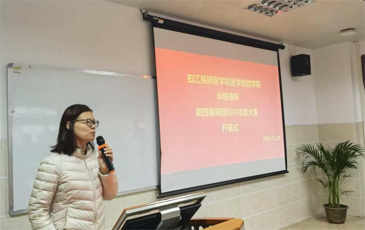 石蜡切片作为病理学诊断的基础,石蜡切片技能是医学实验技术专业学生必备的基本操作技能。为提高医学实验技术专业学生的专业技能,促进学术交流,培养高素质的医学实验技术人才,2024年12月29日由医学检验学院医学实验技术教研室承办的广西华银康杯第四届病理切片技能大赛在学校7栋综合楼6楼实验室顺利举办。医学检验学院庞雅琴院长做开幕式致辞,强调本次技能大赛对于提升学生的实践能力和创新精神具有重要意义,希望同学们能够以此为契机,不断磨练自己的专业技能,为将来成为一名优秀的医学实验技术人才打下坚实的基础。