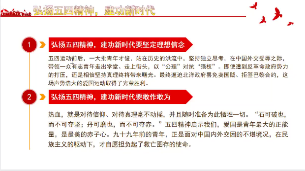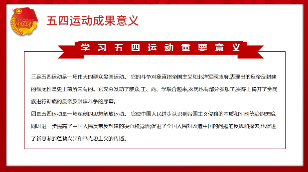 通过本次学习,同学们受益匪浅,收获颇丰,对“五四”精神有了更深的了解,领悟了“五四”精神的要义。