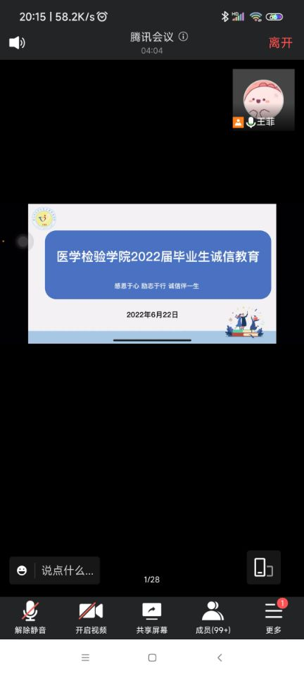 6月22日晚7:30,医学检验学院开展了毕业生征兵再动员、文明离校教育及诚信教育,本次会议通过腾讯会议以线上方式进行,所有毕业生参加。