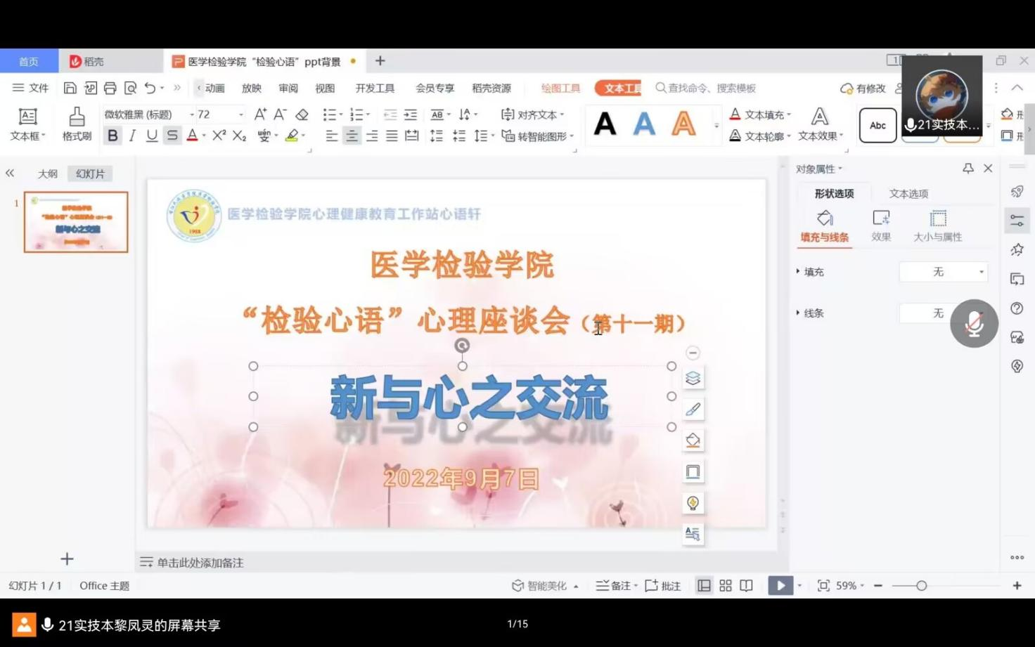 2022年9月7日20:00-21:00,医学检验学院开展第十一期“检验心语”心理座谈会,旨在促进新老生之间的交流,指引大一新生找准学习的方向,更快更好的融入大学生活。参加本次会议的有20、21级学生代表和部分新生代表,会议由黎凤灵同学主持。