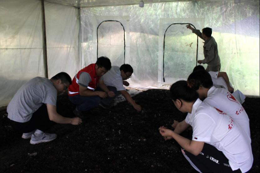 第一书记董明右博士带领团队成员查看新寨村草菇种植基地