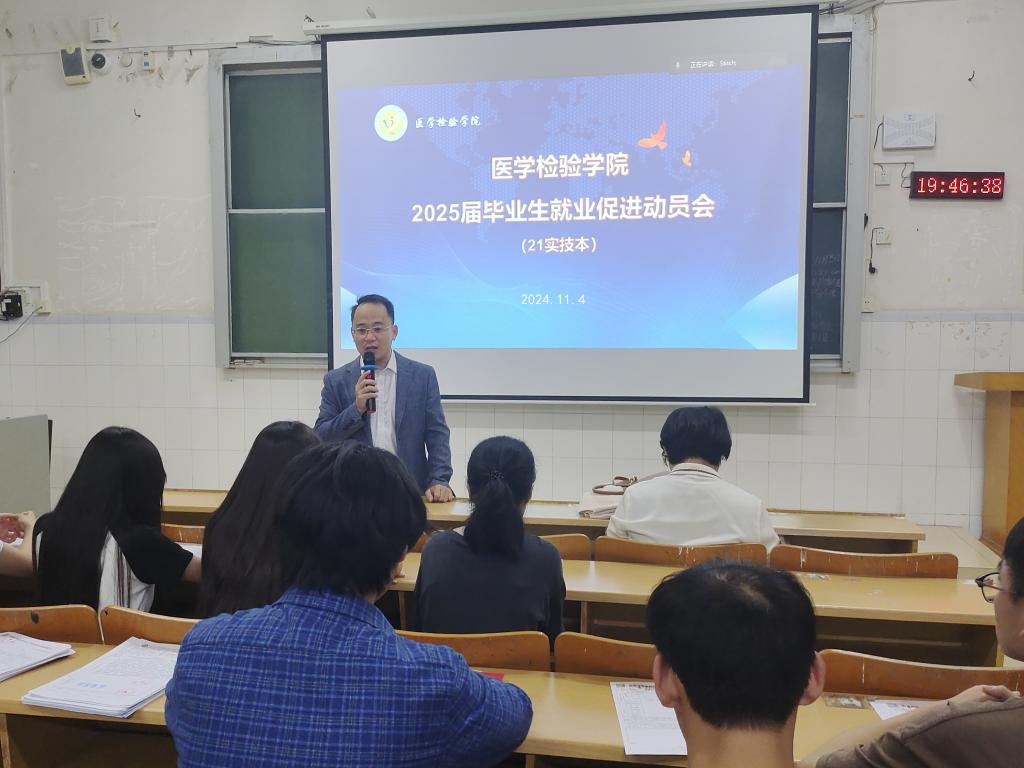 11月4日晚,医学检验学院在5栋506、507、603、604教室分班级召开了2025届毕业生就业促进动员会。学院副院长庞雅琴、副书记梁楚晗、副院长韦贵将、各班就业指导老师以及21级各专业毕业生参加了会议。