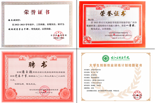 在大学期间,潘玉颖同学不仅在学术领域取得了显著成就,还积极参与了医学检验学院的学生组织工作,担任了易班学生工作站站长、党委干事以及班主任助理等职务。在工作中,她始终坚持高标准要求自己,以身作则,全心全意为同学服务,努力成为他们学习的榜样。由于工作认真,成效显著,她连续两年被评为“校级优秀学生干部”。