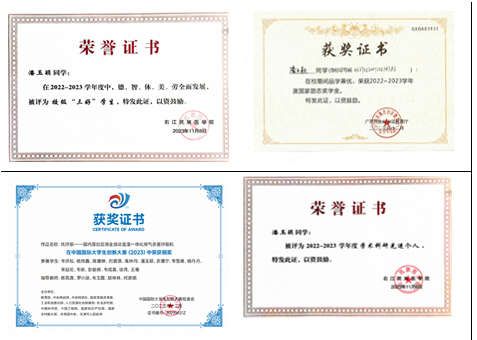 潘玉颖同学始终秉承着一丝不苟的学术精神,不懈追求专业知识的深度与广度,同时锤炼自己的专业素养。她坚守着积极的学习态度和习惯,设定了明确的个人发展目标,并以坚定的步伐,勤奋耕耘,不断探索最适合自己的学习路径。2021-2022学年,她荣获国家励志奖学金,并被取得学术科研先进个人的称号;2022-2023学年,她不仅再次获得国家励志奖学金,还荣获校级三好学生、校级优秀学生干部和学术科研先进个人等称号;2023-2024学年,获得国家奖学金。
