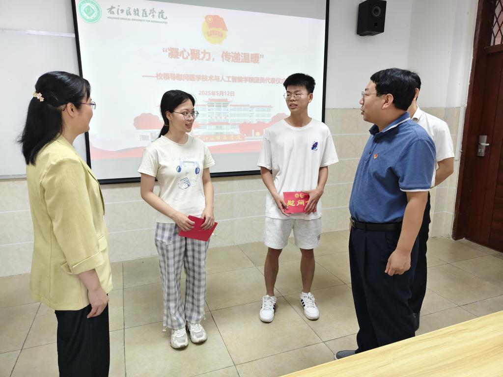 慰问过程中,王俊利副校长与团员青年展开亲切的谈心谈话,并向团员代表发放慰问金。他以关切的态度询团员代表们在学习方面遇到的困难,并鼓励团员青年要扎实学好专业知识,努力做到品学兼优,成为“精医术、懂人文、有理想、能创新”的优秀人才,积极投身学校的改革与发展事业,为国家的繁荣富强贡献青春力量。