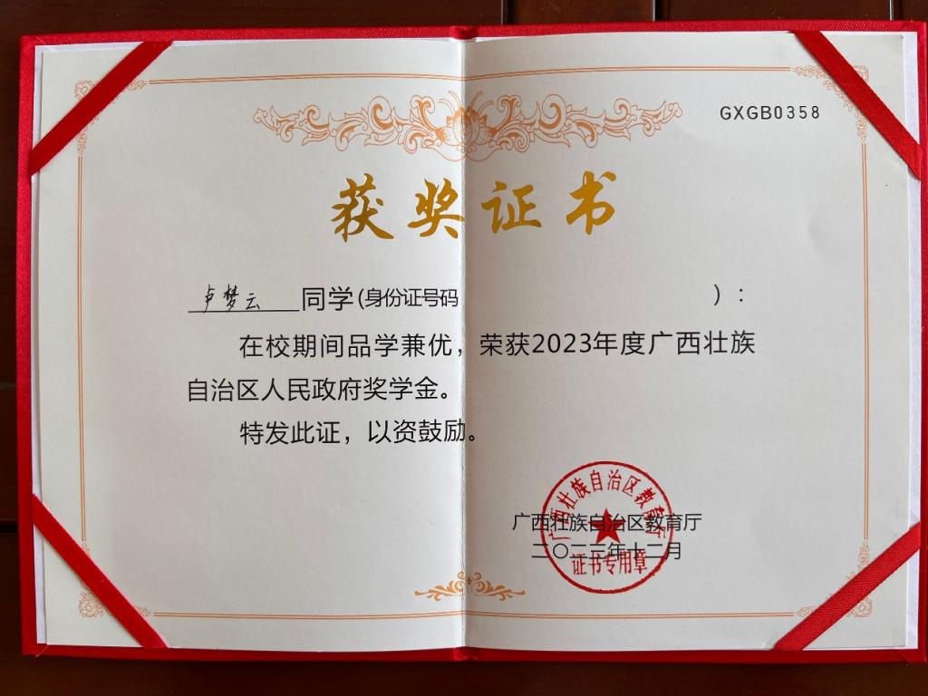 在学术创新方面,卢梦云同学积极进取,获得了第九届中国国际“互联网+”大学生创新创业大赛院系级一等奖。此外,她还荣获2023年广西壮族自治区人民政府奖学金、2023 - 2024学年学生工作积极分子等荣誉,用行动诠释着全面发展的内涵。